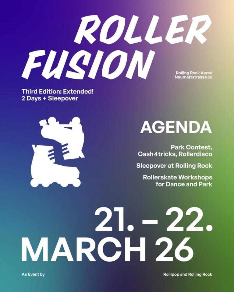 Already the 3rd edition of Roller Fusion in Aarau, Switzerland, an aggressive inline and roller skating event. You get park and dance skating, workshops, and a contest with money prizes at Rolling Rock.