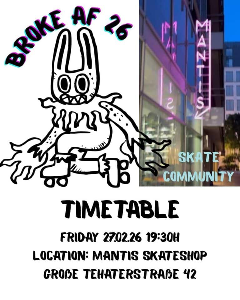 It starts off on Friday, 7.30pm, at the Skateshop Mantis with a hang and skate. There will be drinks and two small ramps. There might be a street skate organized in advance, depending on the weather conditions.